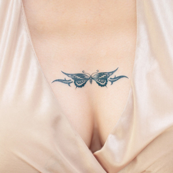 ブルーと黒の蝶が美しいタトゥーシール「腕輪・トライバル蝶」。