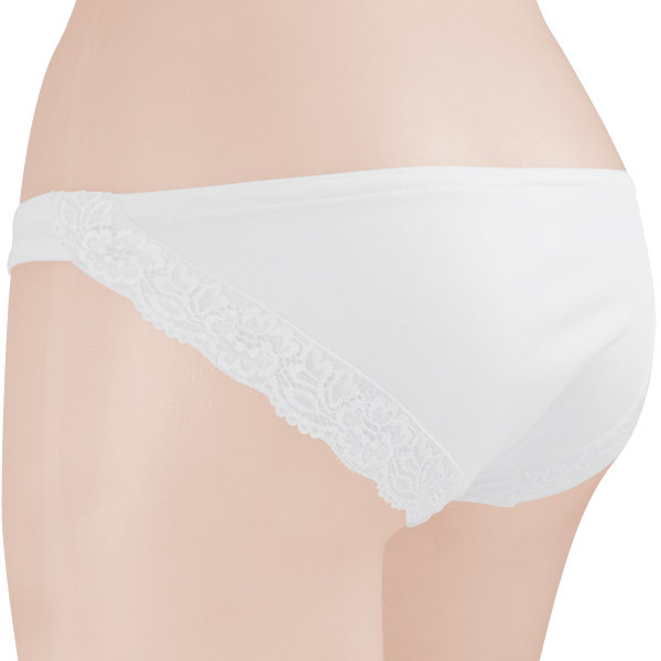 ●シンプルで清楚なホワイトカラー●透け感がセクシーなトリコット生地●脚ぐりに上品なレース飾りをON●フロント中央にミニリボン付き●お尻すっぽりのフルバック●腰と脚回りはインゴム仕立て●日本製・Mサイズ。