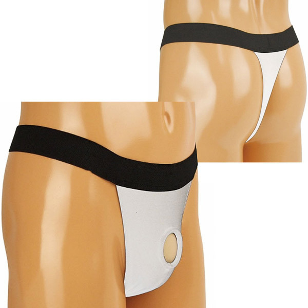 腰周りは太めのゴムヒモを採用し、ガッチリとした安定感のあるはき心地に!スタイリッシュな黒白バイカラーデザインの男性用オープンランジェリーです。