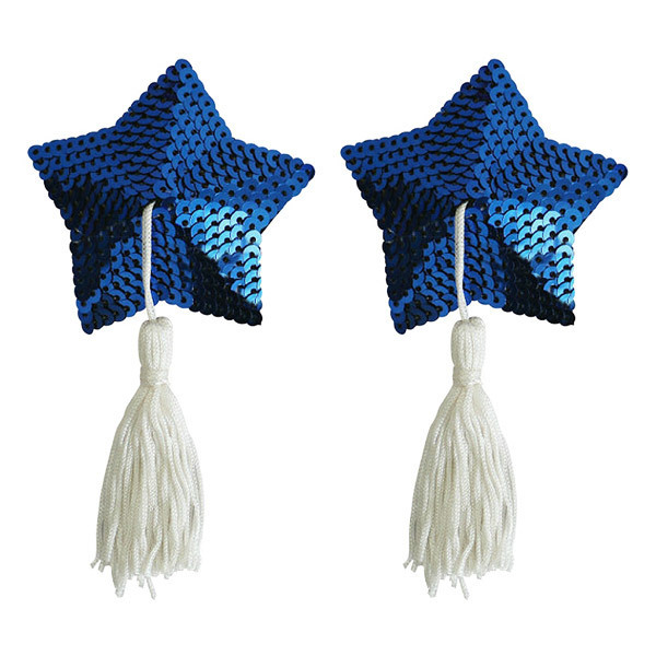 ピタッと貼るだけの簡単仕様♪バストトップ(乳首)に貼るだけで、手軽にオシャレが楽しめる下着感覚のニップルジュエリー「ニップルタッセル スパンコールスター 青」。