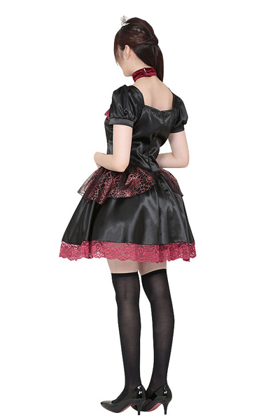 黒の艶やかな生地にアンティークな風合いのレッドスカラップレースをあしらい、ウエスト周りには蜘蛛の巣デザインのレースを施したゴシックスタイル!付属している真紅のチョーカーとキラキラ輝くティアラを身に付ければ、気分はもう闇堕ちプリンセス♪ハロウィン気分を更に盛り上げるなら、タトゥーシールを貼ってみるのも◎