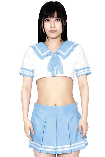 パステルブルーの淡い色味が可愛いミニ丈セーラー服コスプレ。