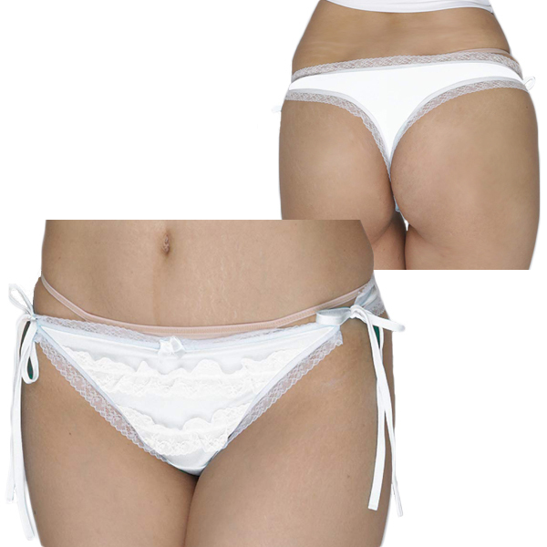 艶やかな光沢のある白生地に同色のフリルとレースを飾り甘く仕上げた日本製Tバック(白)。