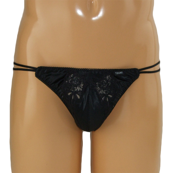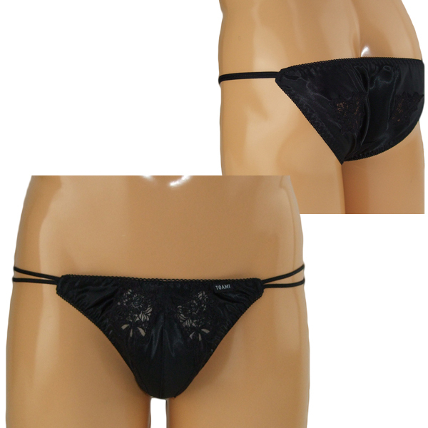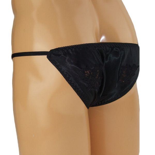 女装下着としても最適!高級感のある上品な光沢と花柄のレース刺繍が美しいメンズ用フルバック(黒)。