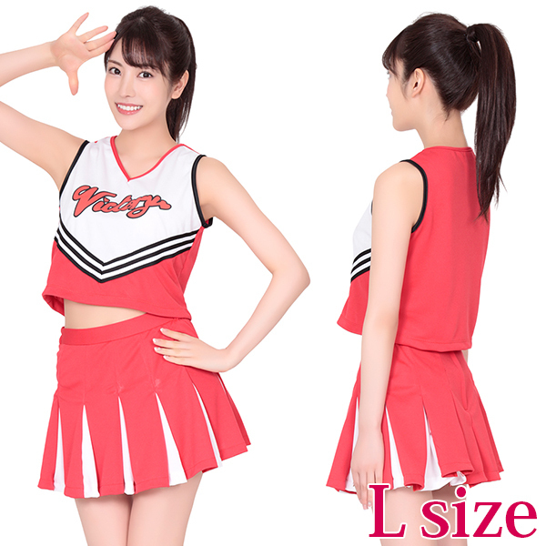 情熱的な赤のチアガール衣装で頑張る皆を元気に応援!大人気ロングセラーのチアガールコスプレに大きめサイズが登場♪胸元には大きく「VICTORY」に文字をプリント!動くたび赤×白のミニ丈プリーツスカートが綺麗に広がります♪