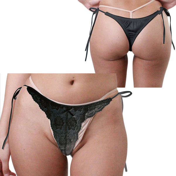 ■光沢生地にレース付き脇ヒモTバック Lサイズ ブラック