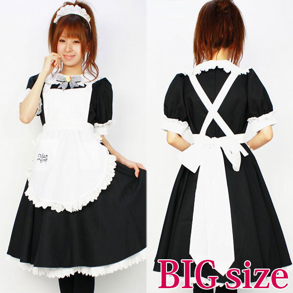 BIGサイズ:B92〜100cm・W78〜84cm 丈:ワンピース108cm(袖丈30cm)・ペチコート67cm セット内容:ワンピース(後ろファスナー、袖パフスリーブ、袖、襟繰りにレース付)・エプロン(肩紐下部にボタン付、ポケット付)・ペチコート(裾レース付、ウェストゴム仕様)・カチューシャ(全フリル)・ブローチ(安全ピン付)・メイドキャップ(クリップ付)