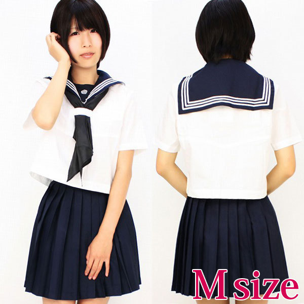 Mサイズ:B78〜95cm・W〜72cm 丈:上着44cm(袖丈22cm、肩幅40cm)・スカート39cm セット内容:上着(横ファスナー、襟に3本ライン入り(白色)、スカーフ留め付き、胸当てに校章入り(白色)、胸ポケット(縫い付け))・スカート(横ファスナー、アジャスター有り)・スカーフ