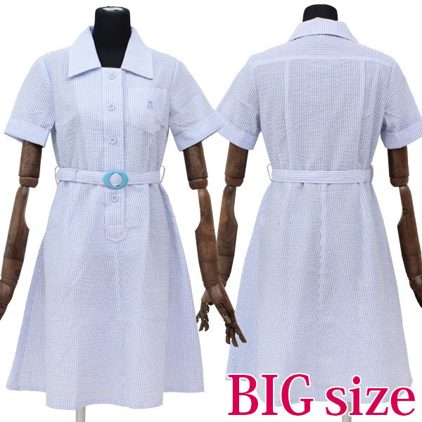 BIGサイズ:B〜102cm・W〜92cm 着丈99cm 袖丈24cm 肩幅43cm セット内容:ワンピース(前ボタン・スカートポケットあり)、ベルト(長さ調節可・、スナップボタン付き) 素材:ポリエステル65%、コットン35%