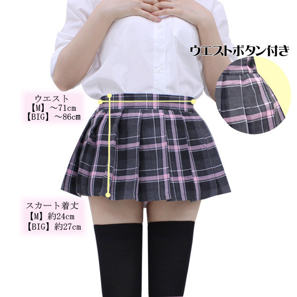 ●丈27cmの超ミニプリーツスカート●黒×グレー×ピンクのチェック柄●ウエスト〜86cmのBIGサイズ●サイドファスナー&ボタン留め●ウエスト後ろ一部ゴム仕様。