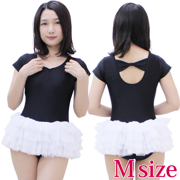■チュールスカート付き半袖レオタード(後ろリボン) 黒×白 M