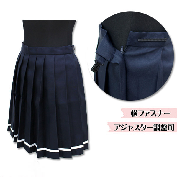 BIGサイズ:W78〜84cm スカート丈48cm セット内容:スカート単品(横ファスナー、アジャスター調節可) 素材:ポリエストル100% 無地プリーツスカート単品 色:紺×白ライン