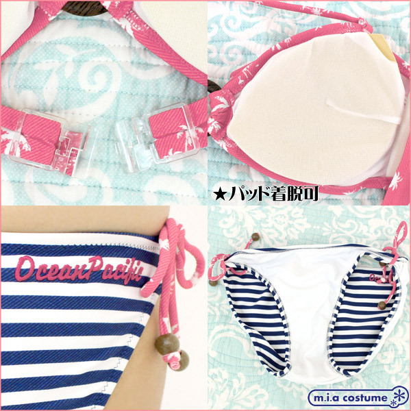 ヤシの木柄をプリントした南国感のあるブラに、青×白の横ボーダー柄ショーツを組み合わせた可愛い一着!ブラはパッド付きで着脱可能