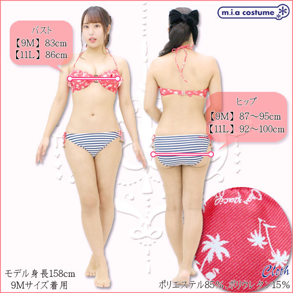 9Mサイズ:B83cm・H87〜95cm セット内容:トップス(パッド着脱可、ワイヤー無し)、ビキニショーツ 素材:ポリエステル85%、ポリウレタン15% 生産国:日本