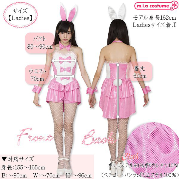 大きめのリボンを3つフロントに飾ったワンピースに、ペチコートパンツや付襟、ウサ耳カチューシャなど小物含めて6点がセットになったお得なバニーガール衣装♪後ろの丸い尻尾とウサ耳を外せばアイドル衣装としても使用できます。