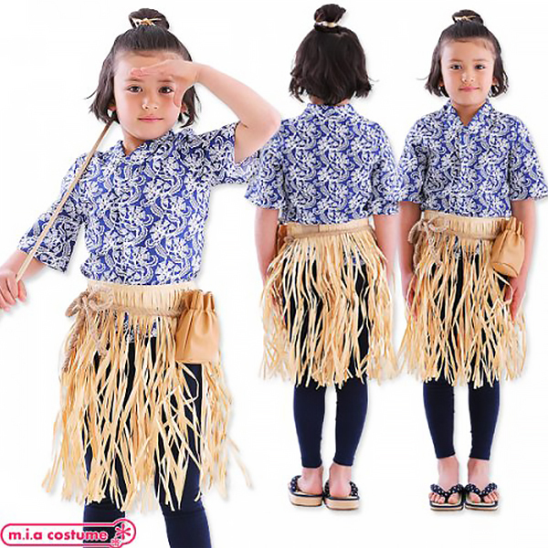 対応サイズ:身長100〜120cm・B〜66cm・〜58cm 実寸:B68cm・W50〜60cm・肩幅28cm・袖丈22cm・着丈(着物45cm・腰みの42cm) セット内容:着物(前ファスナー)、腰みの(ウエスト面ファスナー)、巾着付腰紐 素材:着物(ポリエステル65%、綿35%)、腰みの(指定外繊維、紙) モデル身長118cm