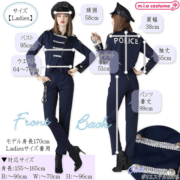 対応サイズ:身長155〜165cm・B〜90cm・W〜70cm 実寸:B95cm・W64〜70cm・肩幅38cm・袖丈55cm・着丈(ジャケット51cm・パンツ99cm)・頭囲58cm セット内容:帽子、ジャケット、パンツ、手錠 素材:ポリエステル100% モデル身長170cm