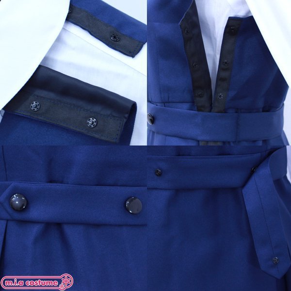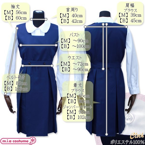 セット内容はブラウス(前ボタン)、ジャンバースカート(裏地有り・脇と肩スナップボタン留め)、ベルトと充実♪ウエストのベルトが特徴的で学園祭や催し物などにもおすすめのコスプレ衣装です。