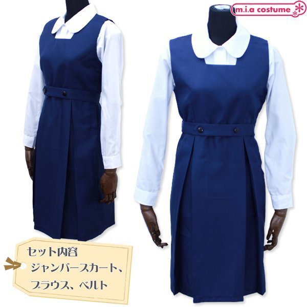 BIGサイズ:B〜100cm・W〜90cm・ブラウス着丈80cm・ジャンパースカート丈102cm・袖丈60cm・肩幅45cm・首周り42cm・ベルト106cm セット内容:ブラウス(前ボタン)、ジャンバースカート(裏地有り・脇と肩スナップボタン留め)、ベルト 素材:ポリエステル100%