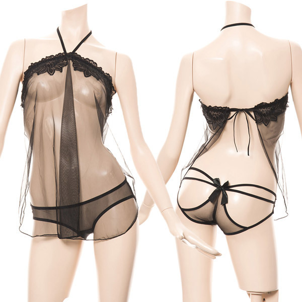 ●エプロン風ホルターベビードール●シアー感抜群のフロントベール●バスト周りが華やぐエレガントレース●大胆ヒップカットのデザインショーツ●ヒップを可愛く飾る中央リボン付き●フロントはシンプルなメッシュ仕上げ。