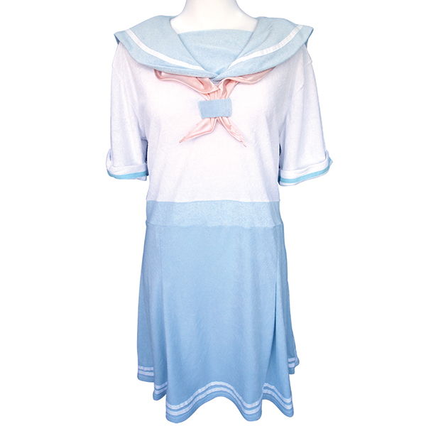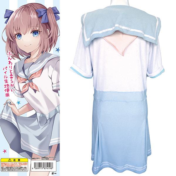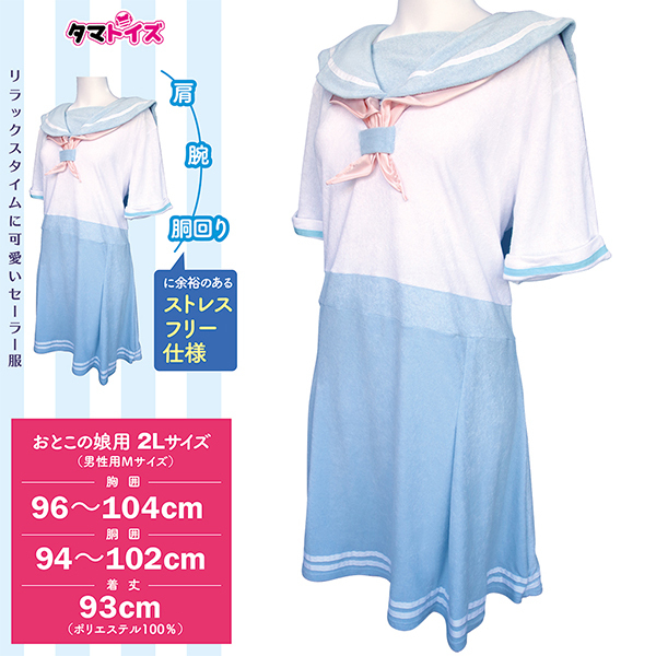 爽やかな水色を基調としたセーラー服タイプのパジャマです♪肩、腕、胴回りに余裕を持たせたストレスフリーな設計で、ゆったりとリラックスした時間を過ごすことができます!柔らかいパイル地を使用しており、肌触りも良く、リラックスや睡眠時に快適さを提供します♪ワンピースタイプで締め付けが少なく、簡単に着用できるデザインです!大きめのサイズ設計なので、体型を問わずフィットし、誰でも心地よく着用できます♪ TAMS-1211